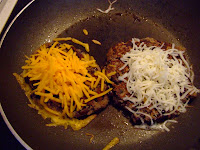 - Form the end product into patties (keep them small, large burgers tend to break when turning them). Spray your pan with your favorite non-stick spray and get it pre-heated to a medium-high heat. Throw a few small burgers in the pan. After a few minutes, take your spatula and turn them. Once you are satisfied with the texture of the outside of the burger, get a sheet of aluminum foil large enough to cover the top of the pan. Get the cheese you like (we typically use sharp cheddar or mozzarella) and top your burger. Take the foil and make a little tent, so the heat stays in (see above picture). After a minute or so, your cheese should be perfectly melted.